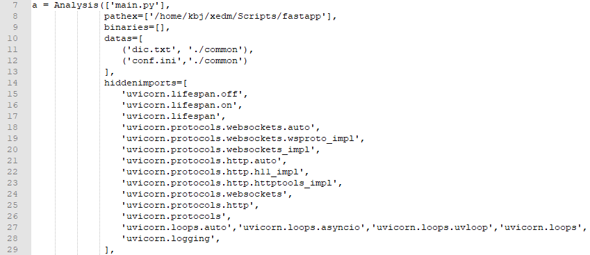 해결방법은 main.spec 파일 내부에 hiddenimports =[] 이 공간에 uvicorn 관련 모듈을 다 박아주면 된다! (필요한거만 박으면됨..)